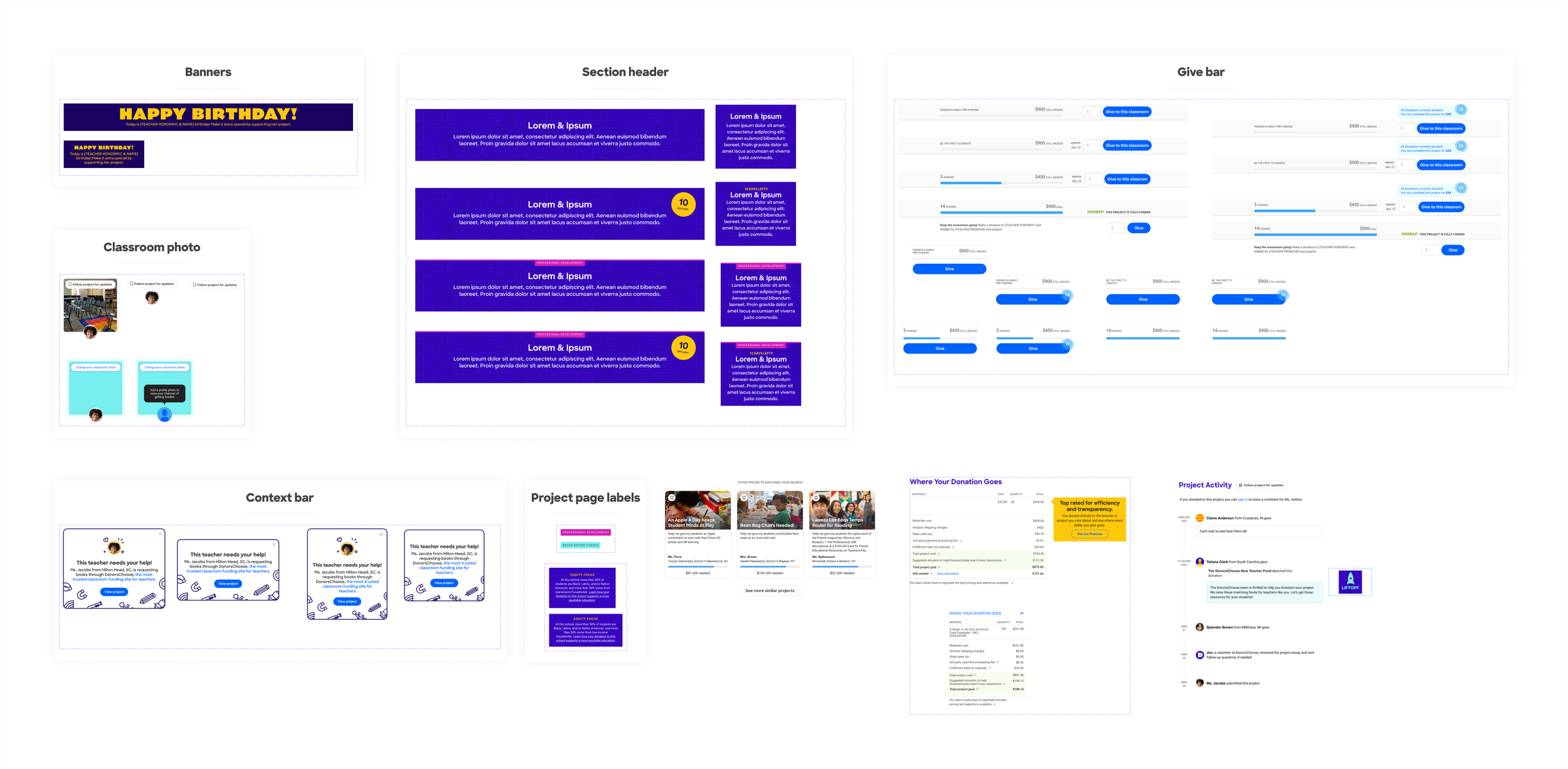DonorsChoose Design System: The first design system at DonorsChoose, built to create a unified library of reusable components. This system improved consistency, streamlined the design-to-development process, and set a scalable foundation for future product enhancements.