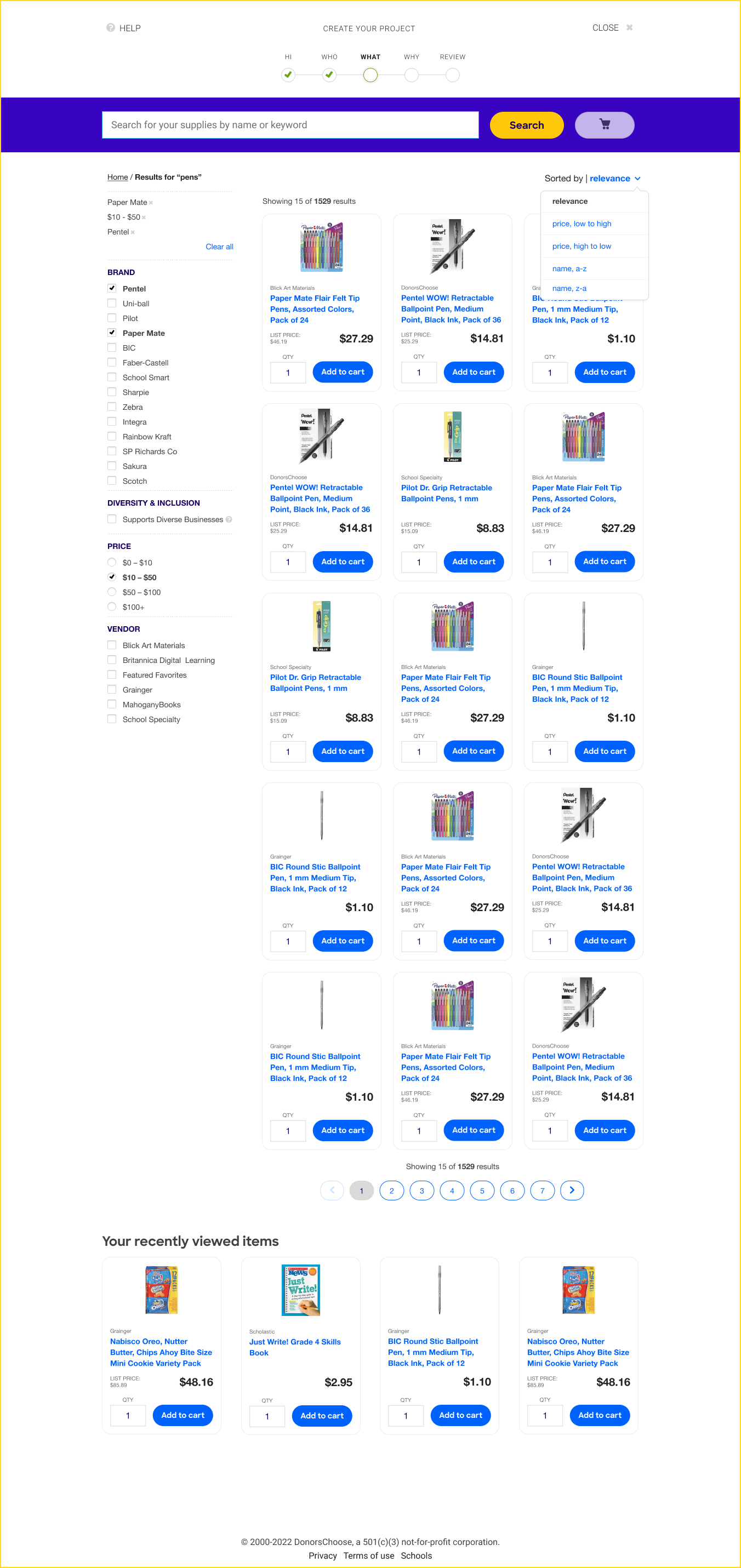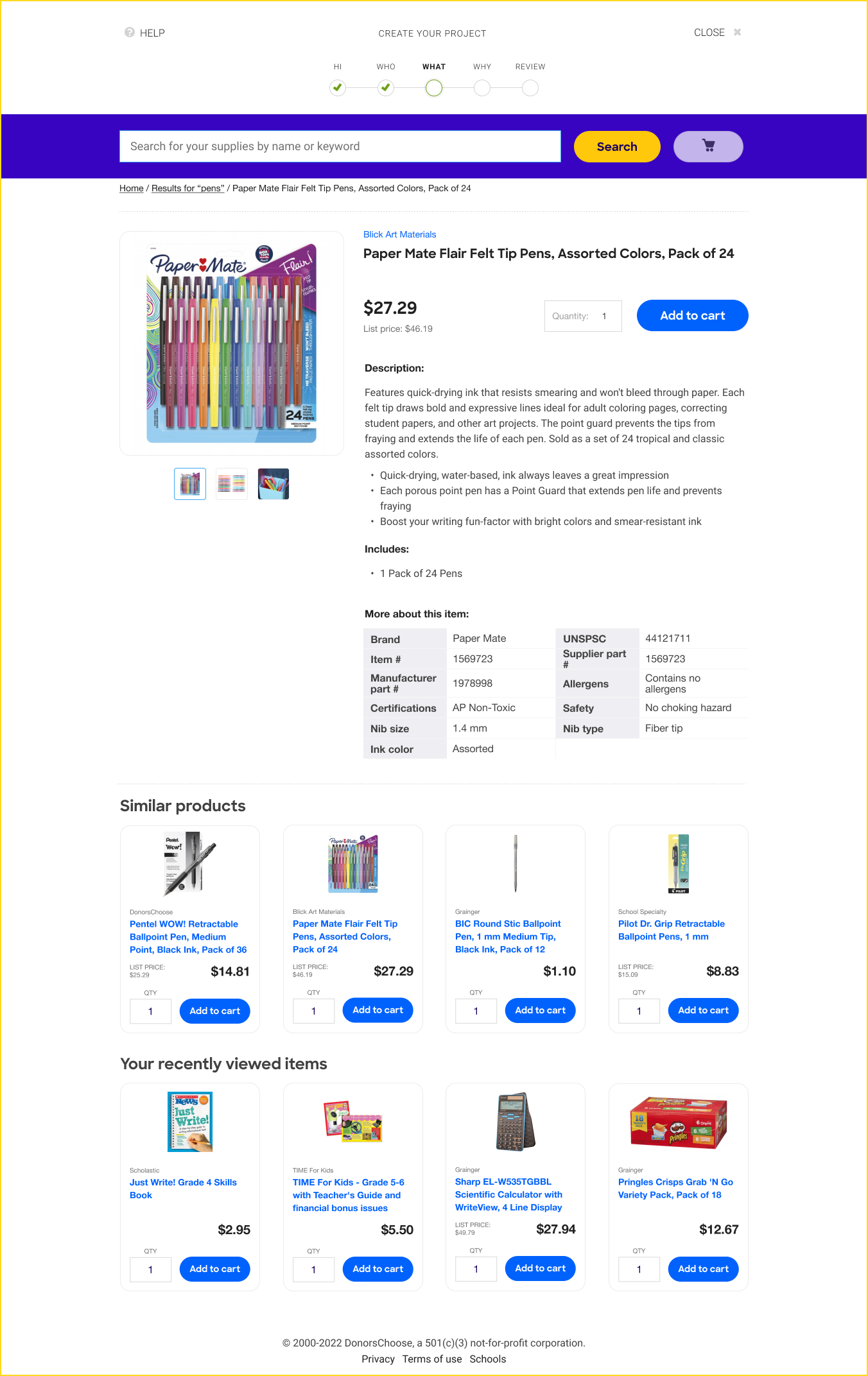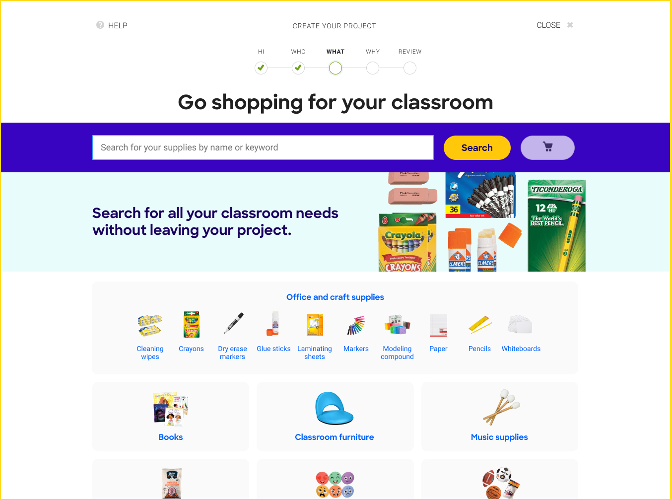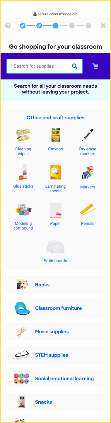 DonorsChoose Universal Shopping: The first integrated e-commerce experience within DonorsChoose's teacher project creation process, streamlining shopping, improving usability, and significantly reducing drop-off rates to help teachers complete their projects more efficiently.