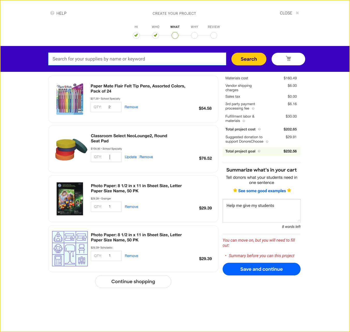 Teachers use DonorsChoose to request classroom supplies by creating a project. The project creation process requires teachers to share classroom details, explain the impact of their requested supplies, and shop across multiple vendor sites.